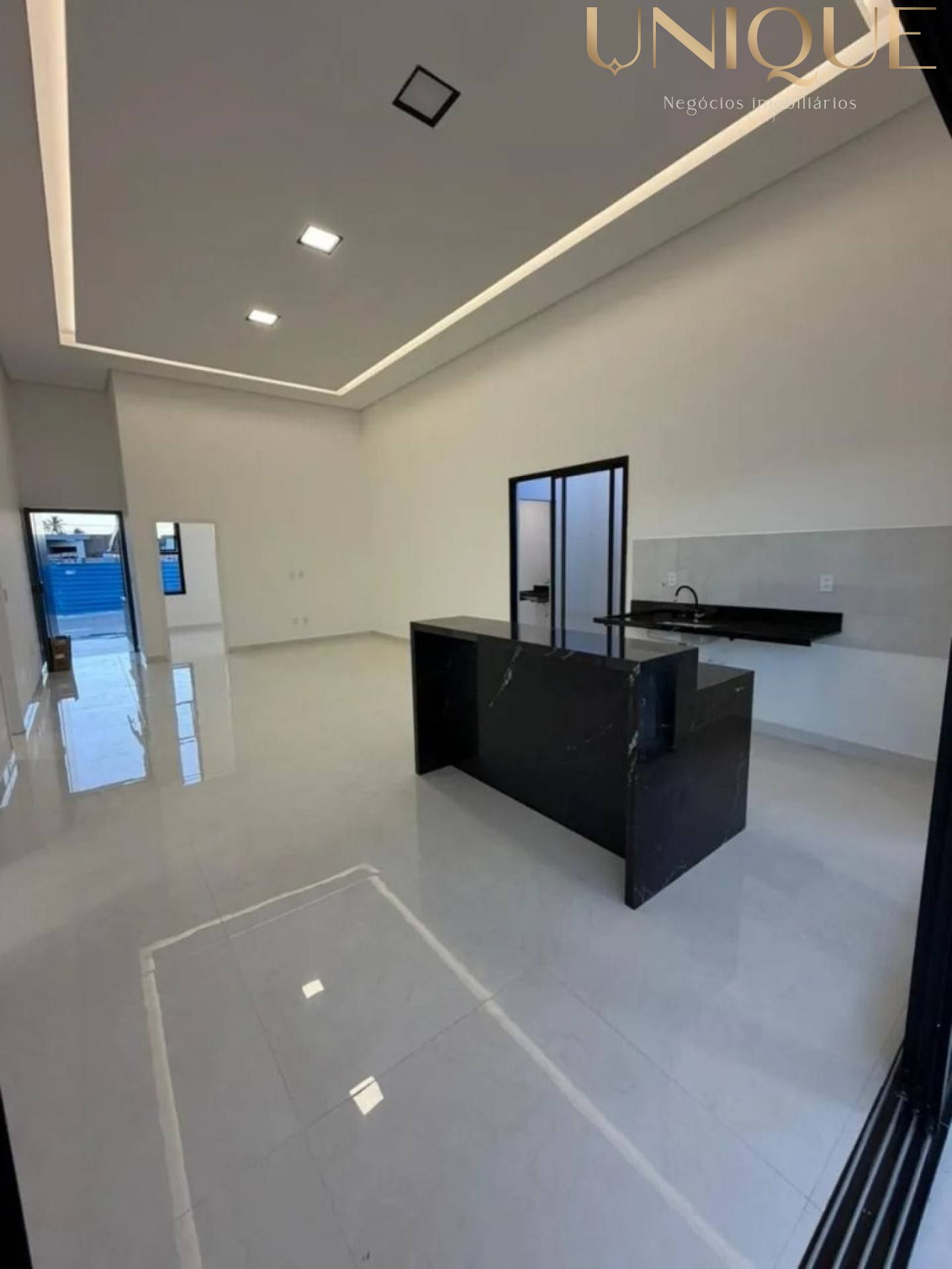 Convivência: Sala de estar e jantar com pé direito amplo, integrada a uma cozinha moderna.