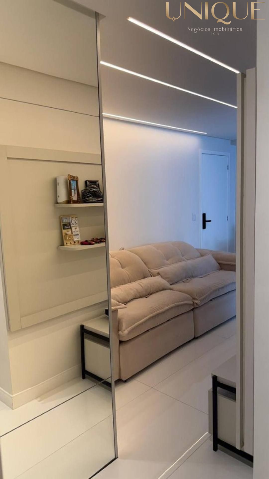 ✔️ Sala aconchegante, com espelho decorativo, que amplia e valoriza o ambiente