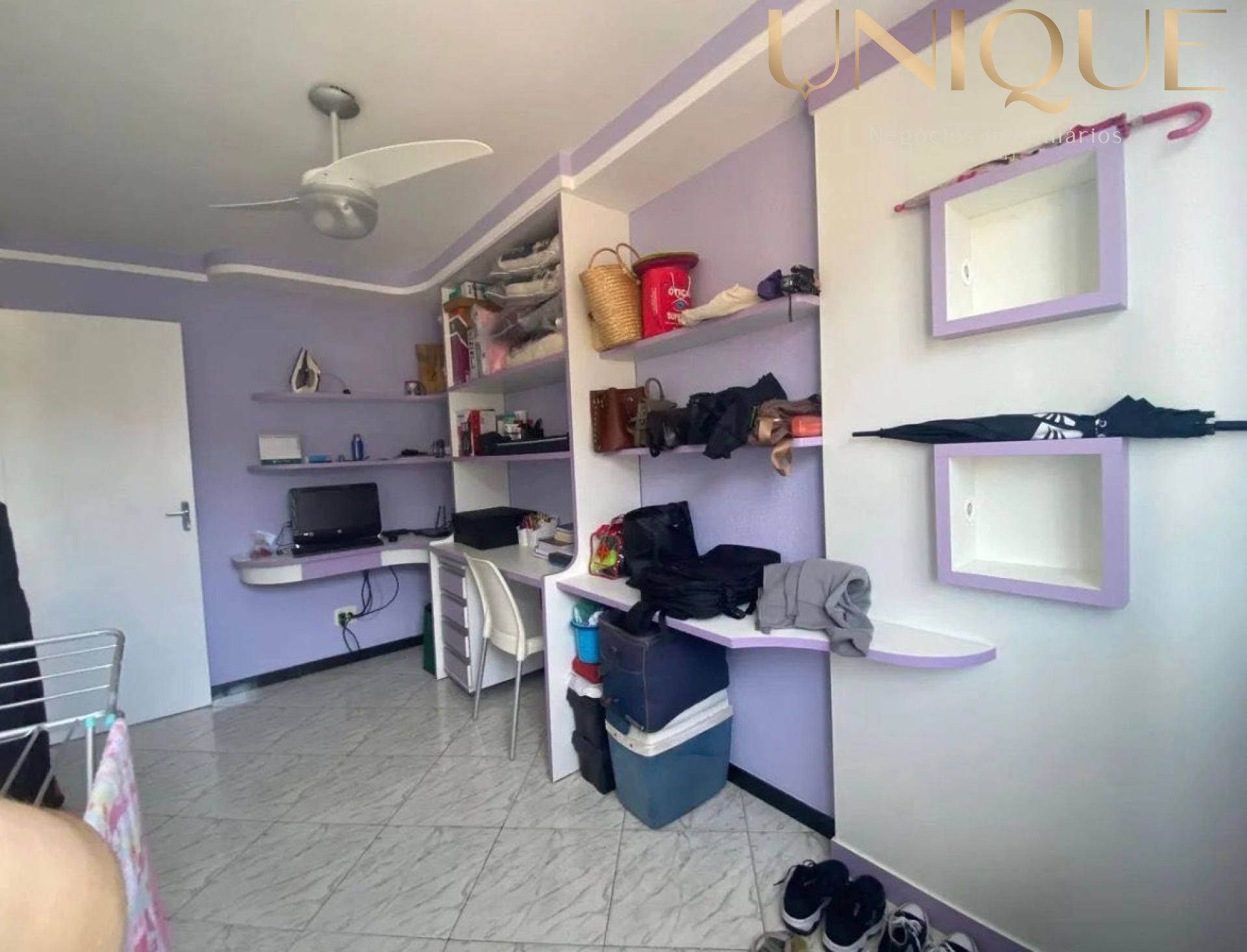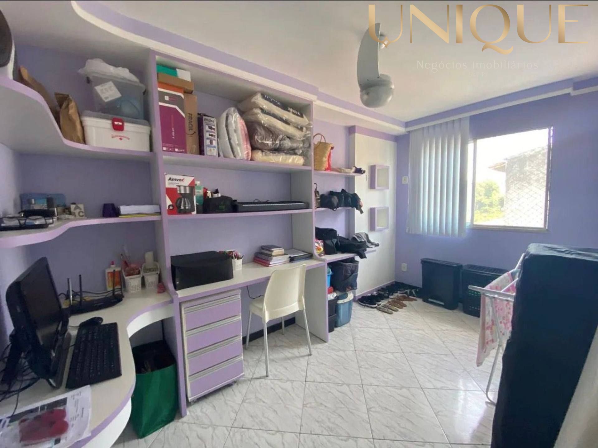 Quarto 2: Estante; painel vertical; gaveteiro escritório 4 gavetas com rodízio; ventilador de teto spirit; persiana.
